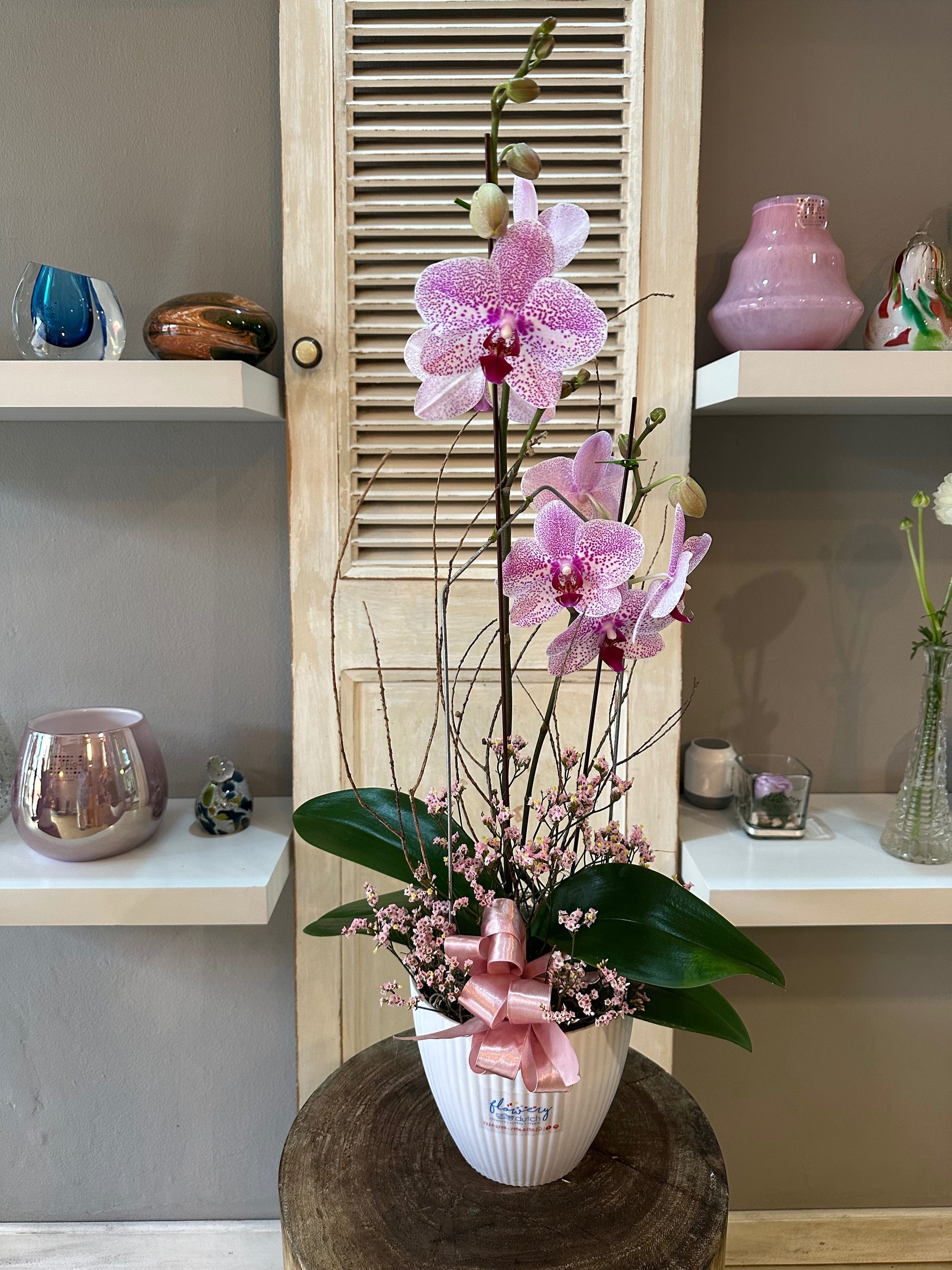 Arreglo de rosas rojas con orquídea en base holandesa.